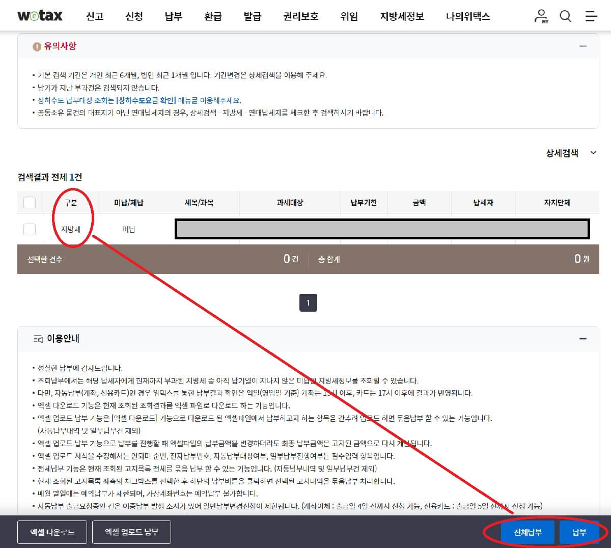 2. '납부'를 클릭하면 납부할 지방세 목록이 보입니다.